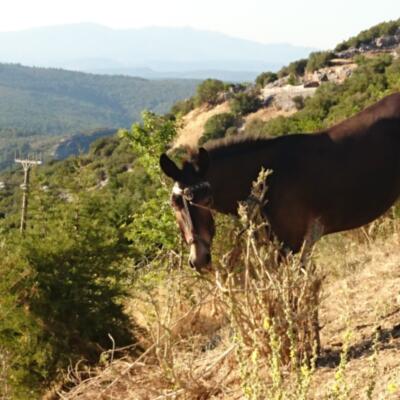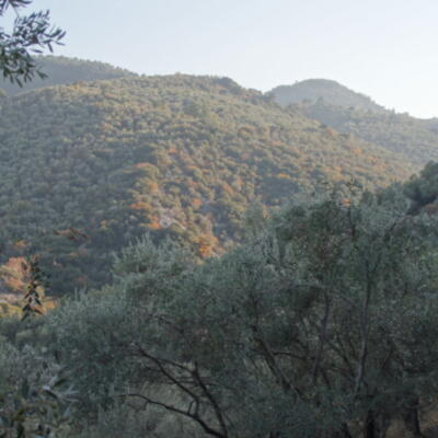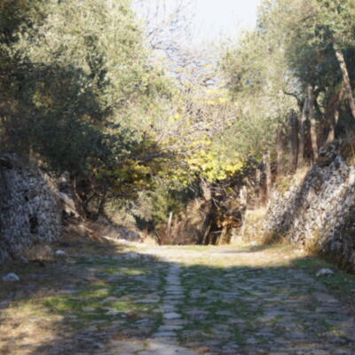 När vi vandrat ytterligare ca 5 km är vi framme vid platsen ”Karini”. Här har resande av tradition stannat sedan lång tid tillbaka för att pausa och svalka sig vid källan i skuggan av de urgamla och enorma ”Platanosträden”. Här finns en trevlig taverna där vi hoppas kunna få plats för lite vila och äta en enklare medhavd lunch i närheten.Vi följer sen den gamla ”Patomeni path” som är en gammal kalderimiväg (åsnestig) En stensatt urgammal transportled som går genom ett kulturlandskap av olivlundar upp till Agiassos på 470 m höjd.Vägen kantas ofta av ortsbefolkningen som säljer lokalproducerade varor och drycker.