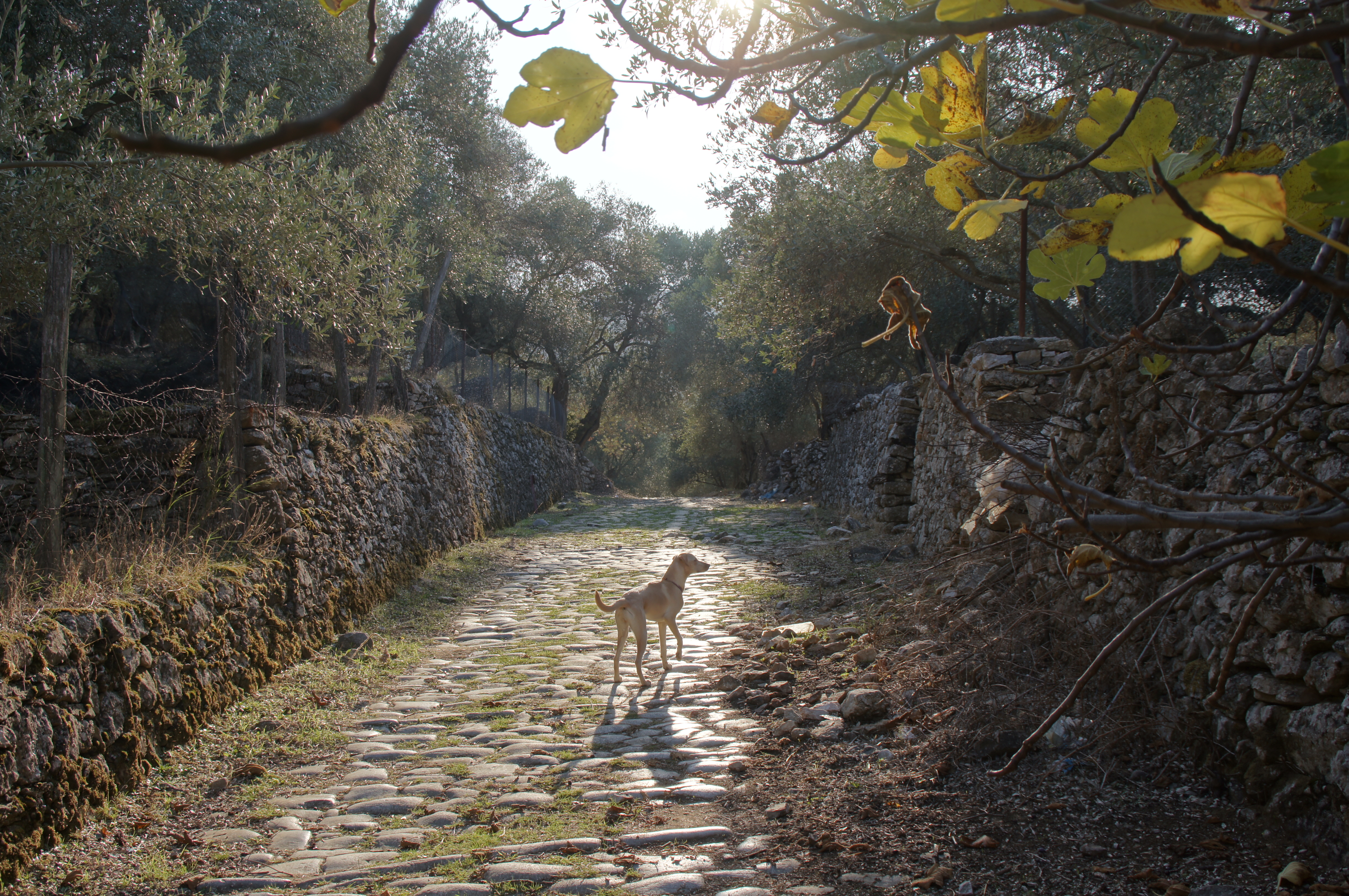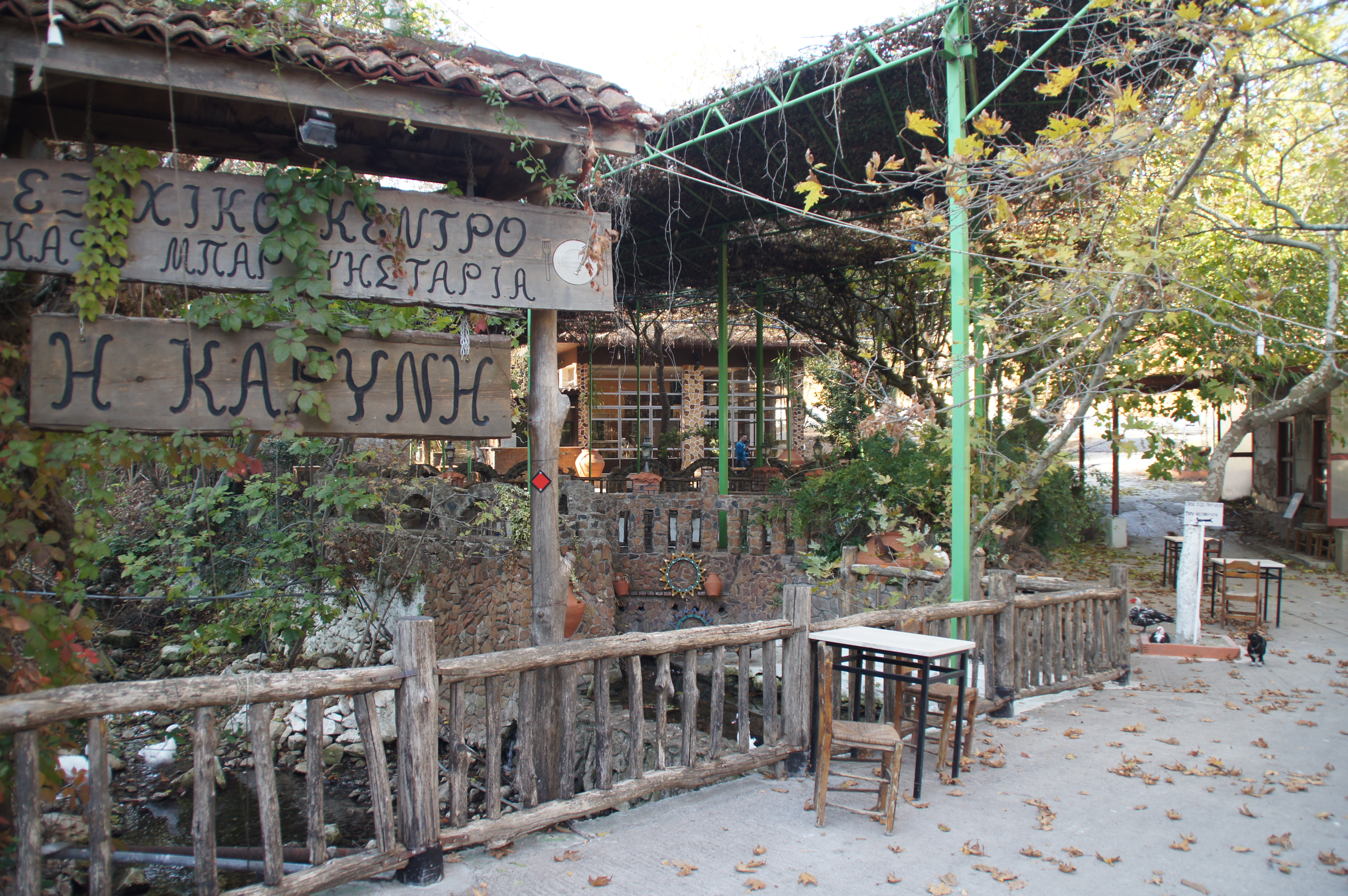 När vi vandrat ytterligare ca 5 km är vi framme vid platsen ”Karini”. Här har resande av tradition stannat sedan lång tid tillbaka för att pausa och svalka sig vid källan i skuggan av de urgamla och enorma ”Platanosträden”. Här finns en trevlig taverna där vi hoppas kunna få plats för lite vila och äta en enklare medhavd lunch i närheten.Vi följer sen den gamla ”Patomeni path” som är en gammal kalderimiväg (åsnestig) En stensatt urgammal transportled som går genom ett kulturlandskap av olivlundar upp till Agiassos på 470 m höjd.Vägen kantas ofta av ortsbefolkningen som säljer lokalproducerade varor och drycker.