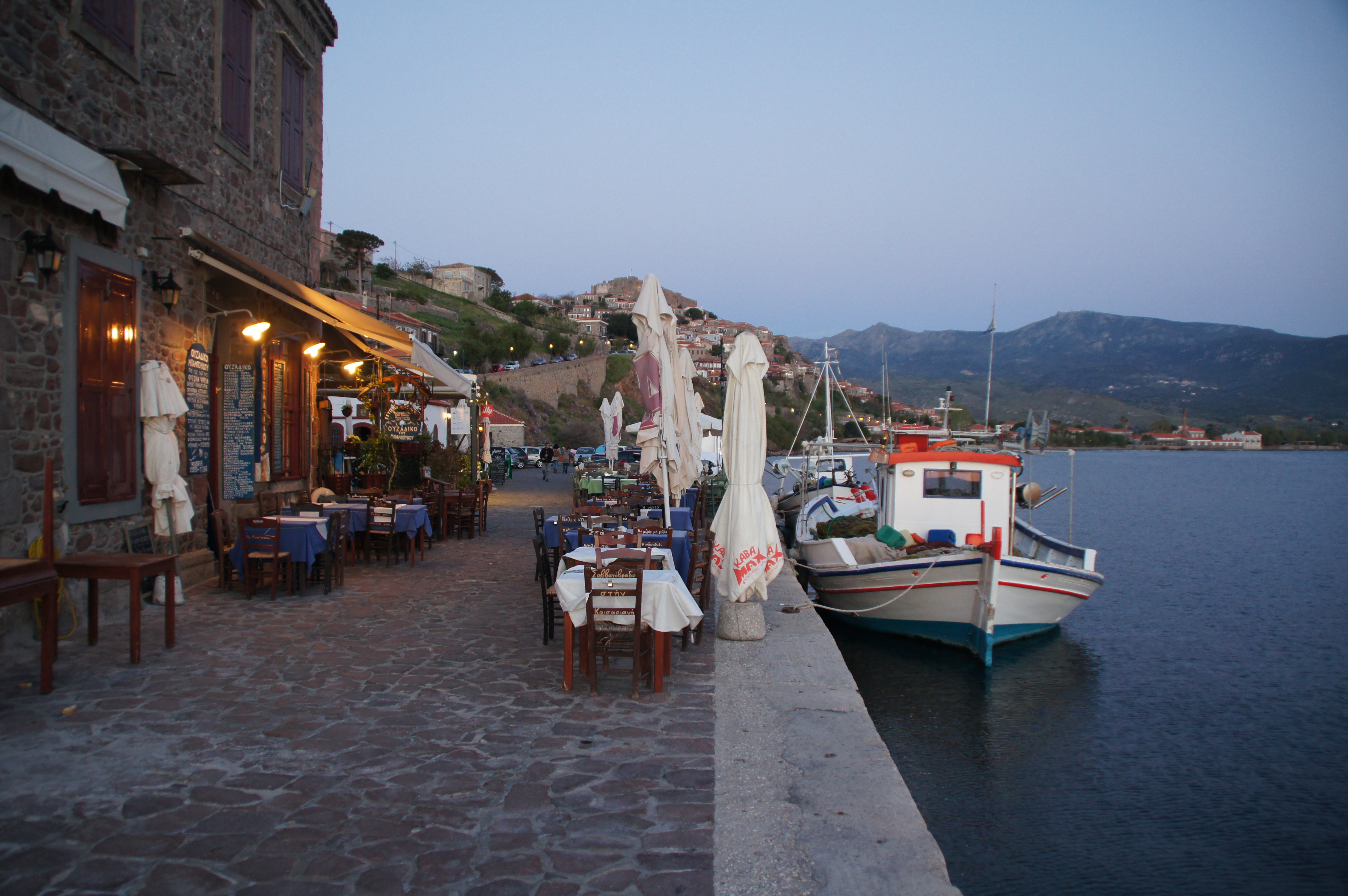 Vi checkar ut efter frukosten och kan ta ett morgondopp innan vi beger oss tillbaka till Mytillini för incheckning på Hotell Heliotrope .