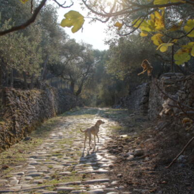 När vi vandrat ytterligare ca 5 km är vi framme vid platsen ”Karini”. Här har resande av tradition stannat sedan lång tid tillbaka för att pausa och svalka sig vid källan i skuggan av de urgamla och enorma ”Platanosträden”. Här finns en trevlig taverna där vi hoppas kunna få plats för lite vila och äta en enklare medhavd lunch i närheten.Vi följer sen den gamla ”Patomeni path” som är en gammal kalderimiväg (åsnestig) En stensatt urgammal transportled som går genom ett kulturlandskap av olivlundar upp till Agiassos på 470 m höjd.Vägen kantas ofta av ortsbefolkningen som säljer lokalproducerade varor och drycker.
