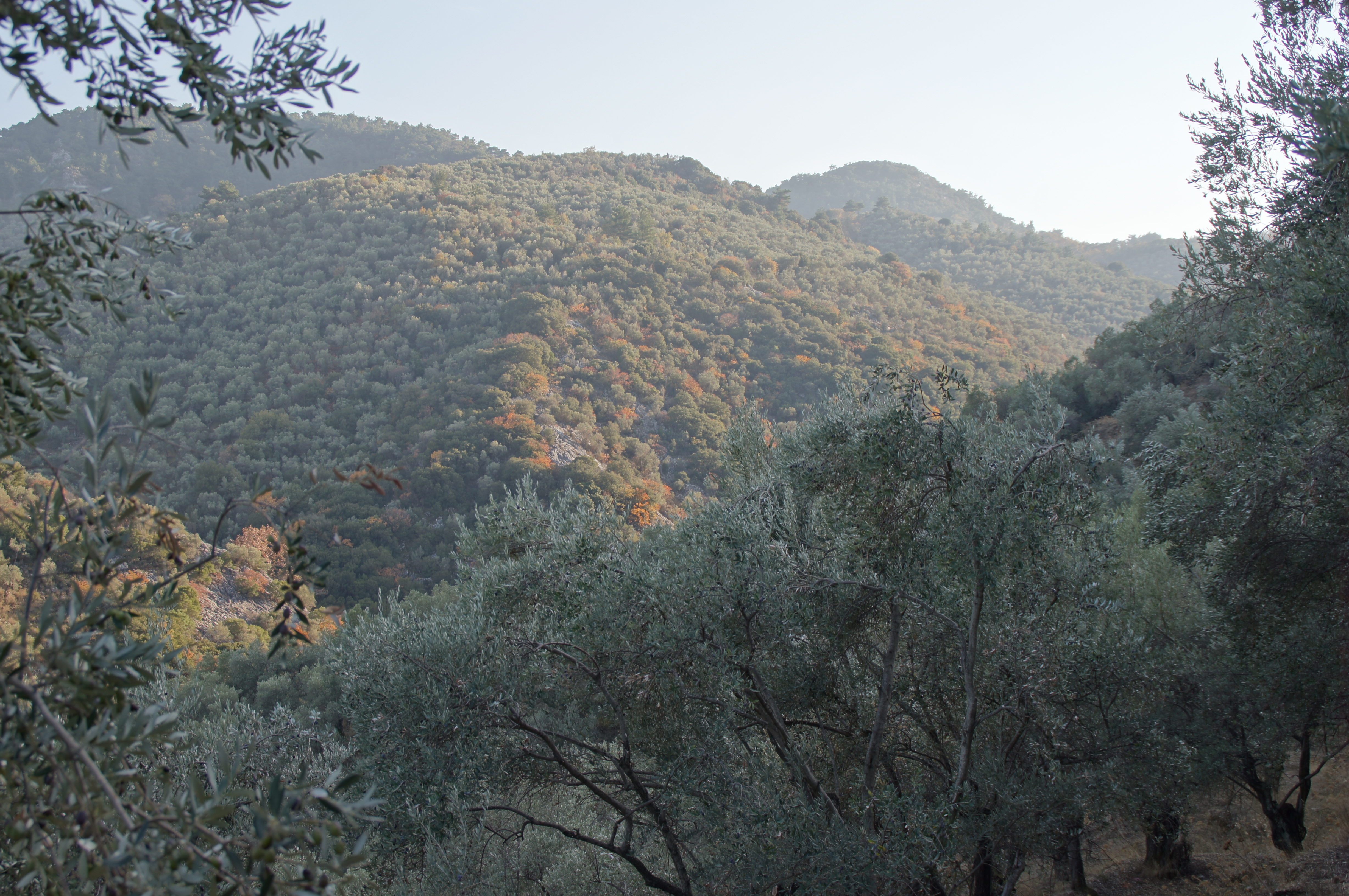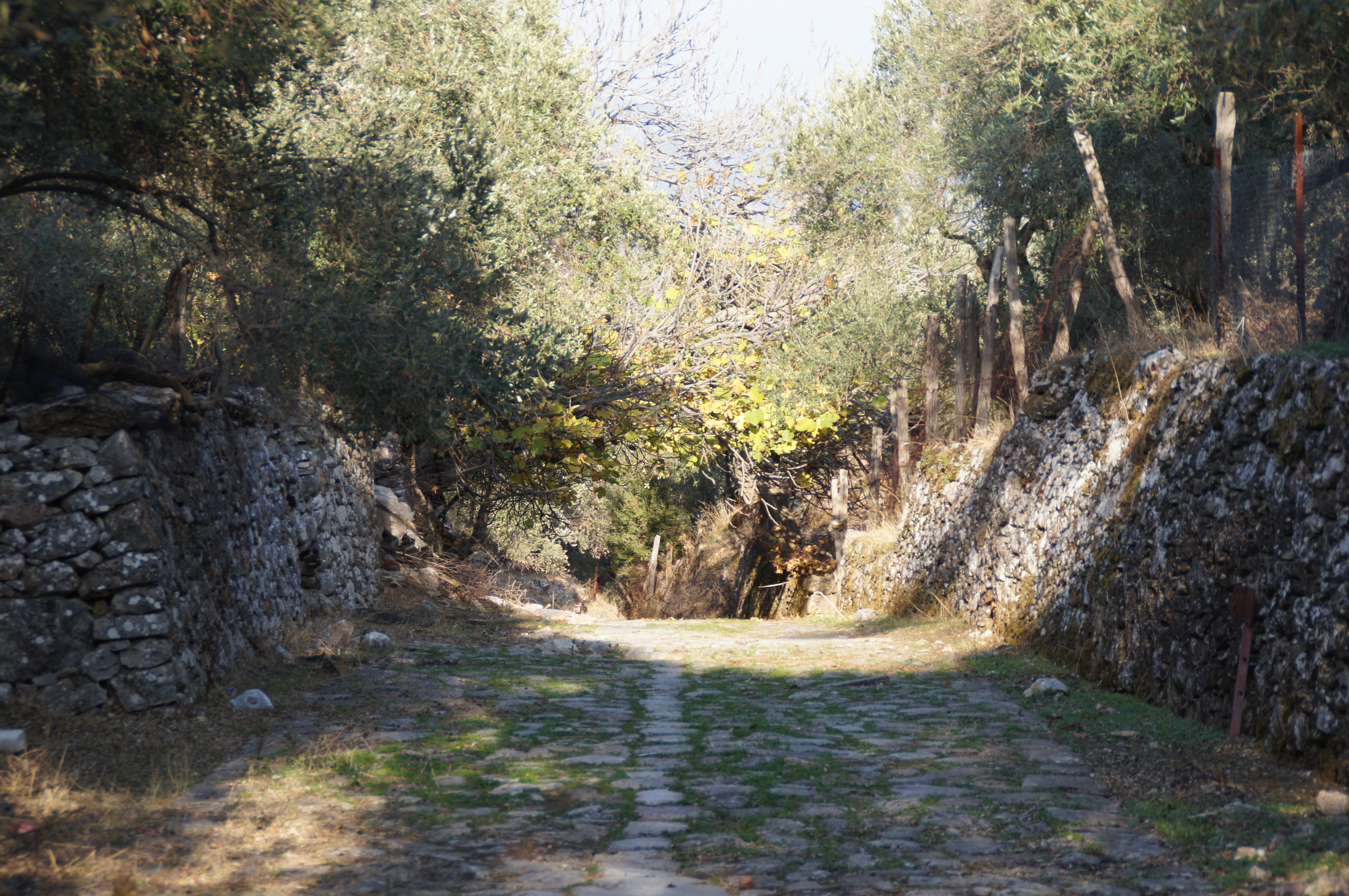 När vi vandrat ytterligare ca 5 km är vi framme vid platsen ”Karini”. Här har resande av tradition stannat sedan lång tid tillbaka för att pausa och svalka sig vid källan i skuggan av de urgamla och enorma ”Platanosträden”. Här finns en trevlig taverna där vi hoppas kunna få plats för lite vila och äta en enklare medhavd lunch i närheten.Vi följer sen den gamla ”Patomeni path” som är en gammal kalderimiväg (åsnestig) En stensatt urgammal transportled som går genom ett kulturlandskap av olivlundar upp till Agiassos på 470 m höjd.Vägen kantas ofta av ortsbefolkningen som säljer lokalproducerade varor och drycker.